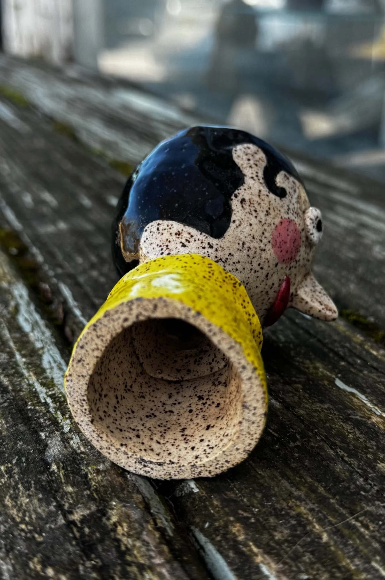 Handcrafted ceramic design with a whimsical human face motif